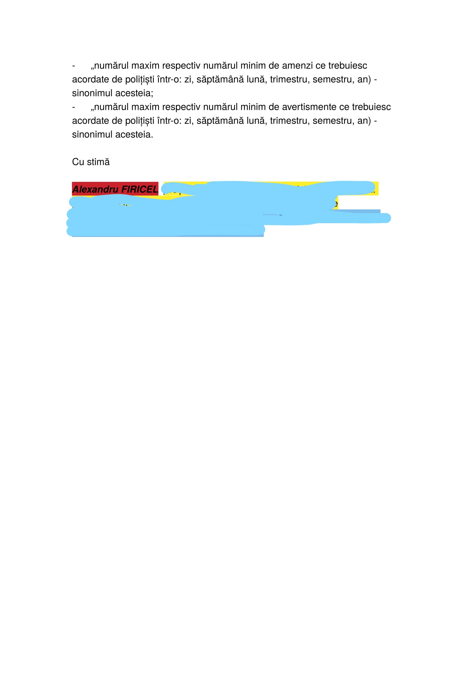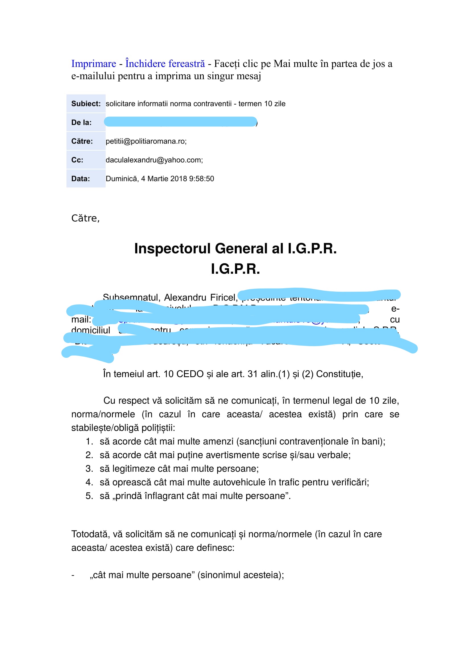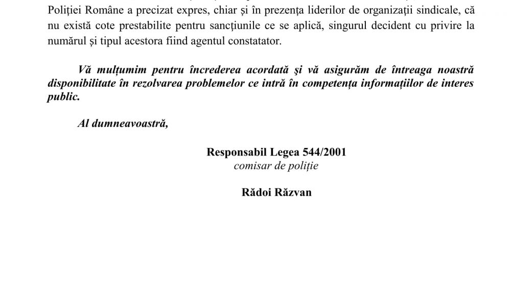 N.R.: Munca de Poliție, munca în folosul cetățeanului și a statului român nu e o muncă de fabrică. Managerii din poliție ar trebui să mai studieze managementul (cărțile de management de pe care stuadiză studenții la ASE sunt ideale pentru acești manageri) și să îl și înțeleagă. Solicităm public Inspectoratului General al Poliției Române și Inspectoratului General al Poliției de Frontieră Române să emită un comunicat prin care „să spulbere” (sau nu) această practică din Poliția Română de aplicare a contravențiilor „pe bandă rulantă”, la normă, ca la fabrică.