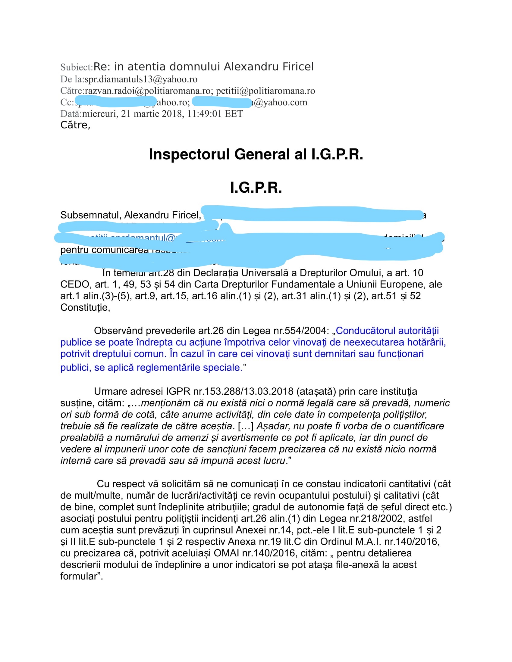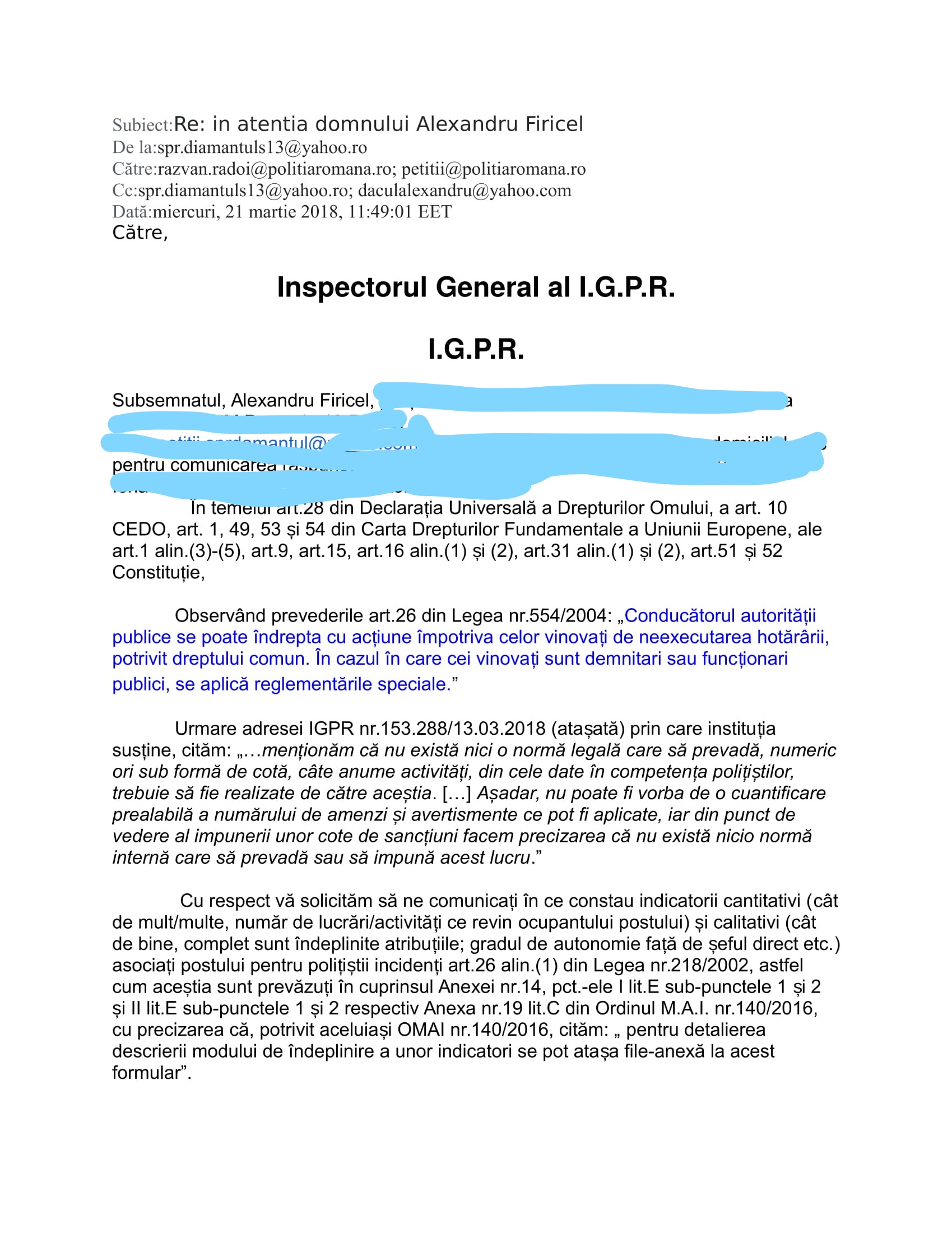 În concluzie, la nivel declarativ, IGPR susține că munca de poliție nu poate fi normată prin „aplicarea de sancțiuni la comandă”, această „normare a muncii de poliție” nefiind aplicabilă evaluărilor anuale pe care polițiștii le susțin prin prisma activității desfășurate. Cu toate acestea, șefi polițiști nu țin cont de nicio Lege/dispoziție (recomandare) ierarhică și fac tot ce au învățat ei când erau „tineri milițieni”: exercitarea abuzivă a funcției manageriale de poliție. Se mai miră instanțele de judecată de ce au atâtea cauze pe rol pentru anularea de contravenții ? Noi, cei din Redacția Incisiv de Prahova suntem lămuriți însă polițiștii care aplică sancțiuni contravenționale „la comanda șefului” ar trebui să știe că, în cazul în care instanța îi anulează procesul verbal de contravenție, va fi tras in personam la răspundere civilă pentru emiterea unui act nelegal, abuziv, plătind cheltuielile de judecată și eventuale daune morale acordate de instanța de judecată. Șeful nu va răspunde niciodată pentru acest abuz, din contră: va face mișto de polițistul sancționat fiindcă „nu s-a descurcat”.