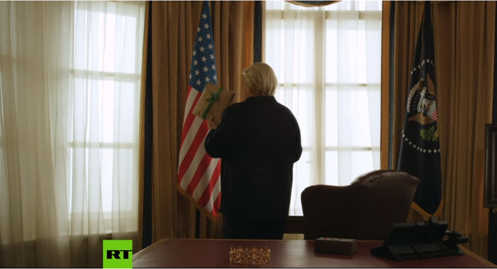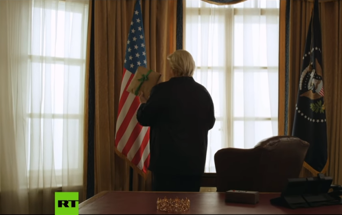 Postul de televiziune RT și-a dat frâu liber imaginației, realizând un video despre dimineața de 25 decembrie, când liderul american, Donald Trump, despachetează cadourile. Printre cutiile primite de la liderii mondial, acesta găsește și un pachet cu o panglică verge.
