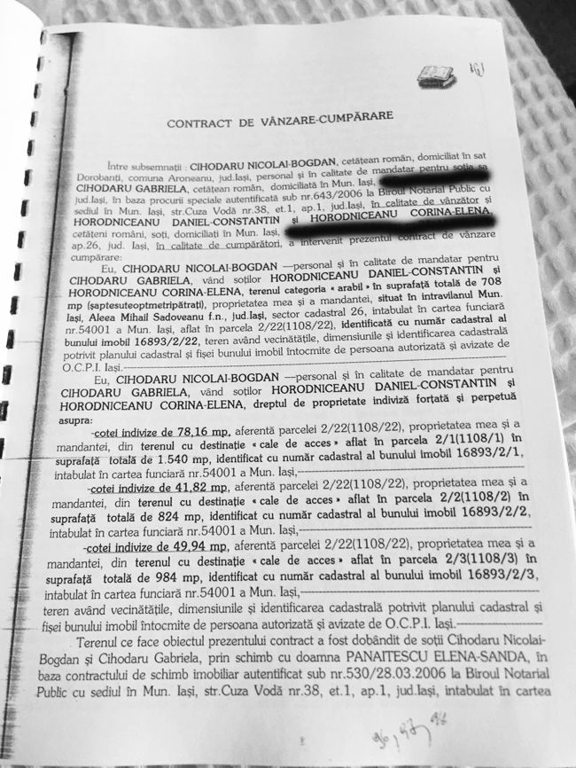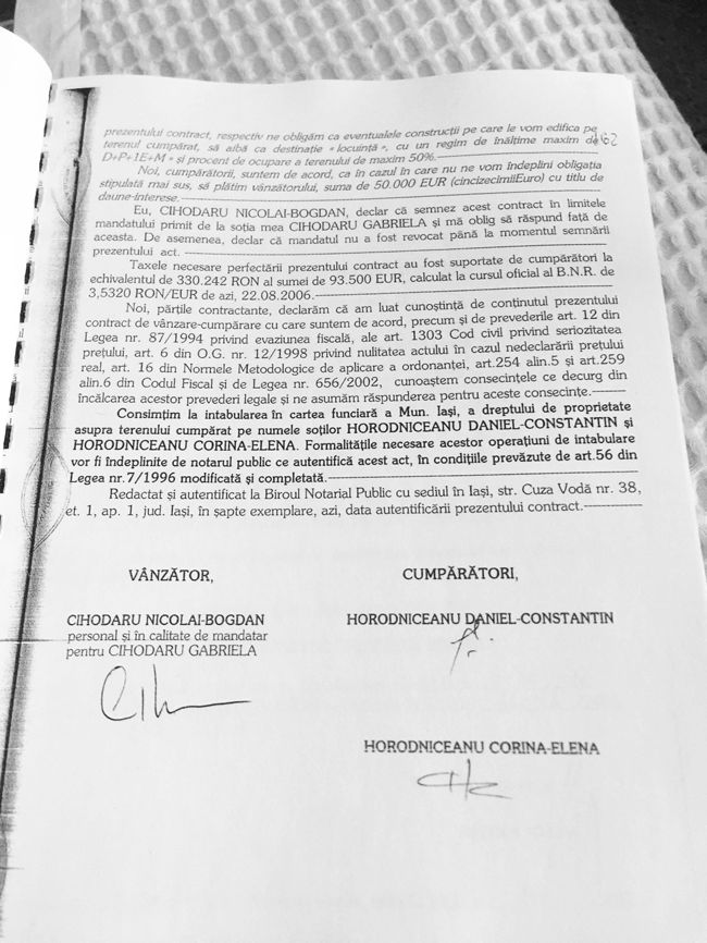 Luminița Ecaterina Mazilu Roboiu, o bătrână văduvă din București, care nu avea moștenitori și care se judeca de ani buni cu Casa de Pensii a Municipiului București pentru recalcularea pensiei s-a decis, la 72 de ani, să doneze miliardarului Bogdan Cihodaru un teren de 2,5 hectare, evaluat de părți la 750.000 euro. Astfel că după ce a primit absolut gratis respectivul teren prin straniul contract de donație, ”regele imobiliarelor” din Iași a vândut o bună parte din respectivul teren. În antecontractul de vânzare-cumpărare, beneficiarul suprafeței de 1,7 hectare în zona Șes Bahlui fiind Paul Diaconu, soțul fostei șefe a DIICOT – Iași, procuroarea Iulia Dascălu. Mai mult, tot prin același act se parafa și o vânzare ulterioară a altor trei terenuri, în suprafață totală de 16.600 mp. Acum, după ani de zile în care a condus structura teritorială a DIICOT Iași, Iulia Dascălu a ieșit la pensie, în spațiul public evaluatorii bancari apreciind ”imperiul imobiliar” al famliei acesteia la 19 milioane de euro. Însă Daniel Horodniceanu tocmai ce se pregătește pentru interviul în cadrul selecției pentru alegerea noului șef al DIICOT. Astfel că este de înțeles și preocuparea structurilor contrainformative de a se lămuri între timp și în ceea ce privește situața terenului tranzacționat între Bogdan Cihodaru și Daniel Horodniceanu la notarul public Necula Ioana, barem pentru a nu se lăsa loc de interpretări. Mai ales că în fond și la urma urmei chiar asta este ”fișa postului” pentru protecția internă…