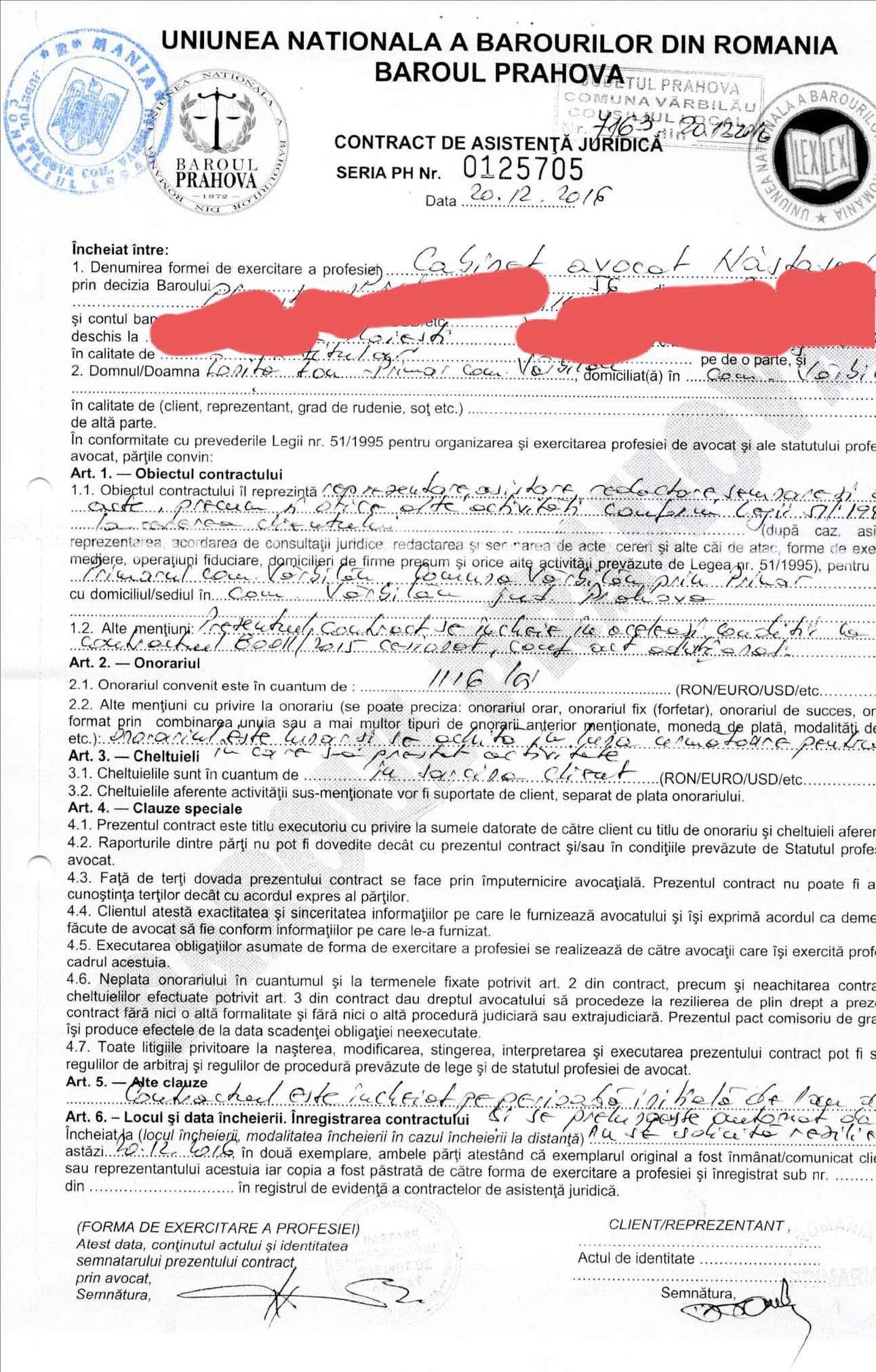 In pofida acestor fapte, pentru care acest avocat, membru al Baroului Prahova, a fost cercetat, alaturi de fostul prefect, Corneliu Popescu, structura mafiota din cadrul orasului Breaza, l-a promovat, intervenind pe langa persoana primarului Gheorghe Richea, pentru asigurarea unui contract de asistenta juridiciara, in “contencios”, in pofida faptului ca activitatea prestatorului este aproape nula si fara niciun rezultat efectv, in realitate munca fiind efectuata de corpul de specialisti, profesionisti si juristi ai Primariei Orasului Breaza.