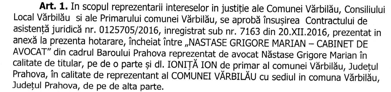 Mai jos, cititorii pot observa extrasul hotararii primarului comunei Varbilau, Ionita Ion, la asa-zisa propunere, a inspectorului achizitii Miclea Angelica Georgiana, din cadrul aparatului de specialitate al primarului, care a intocmit un raport inregistrat, in acest sens (nr.475), privind insusirea contractului de asistenta juridica cu acest avocat: