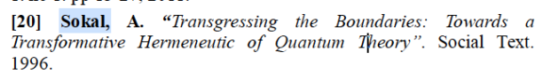 - Și chiar Alan Sokal, profesorul de fizică de la la New York University, cunoscut ca autorul ,,farsei Sokal’‘ atunci când a demonstrat în 1996 că în reviste ,,științifice” pot să apară trăznăi, publicând un articol farsă ,,Transgressing the Boundaries: Towards the Transformative Hermeneutics of Qunatum Gravity” în revista ,,Social Text”.