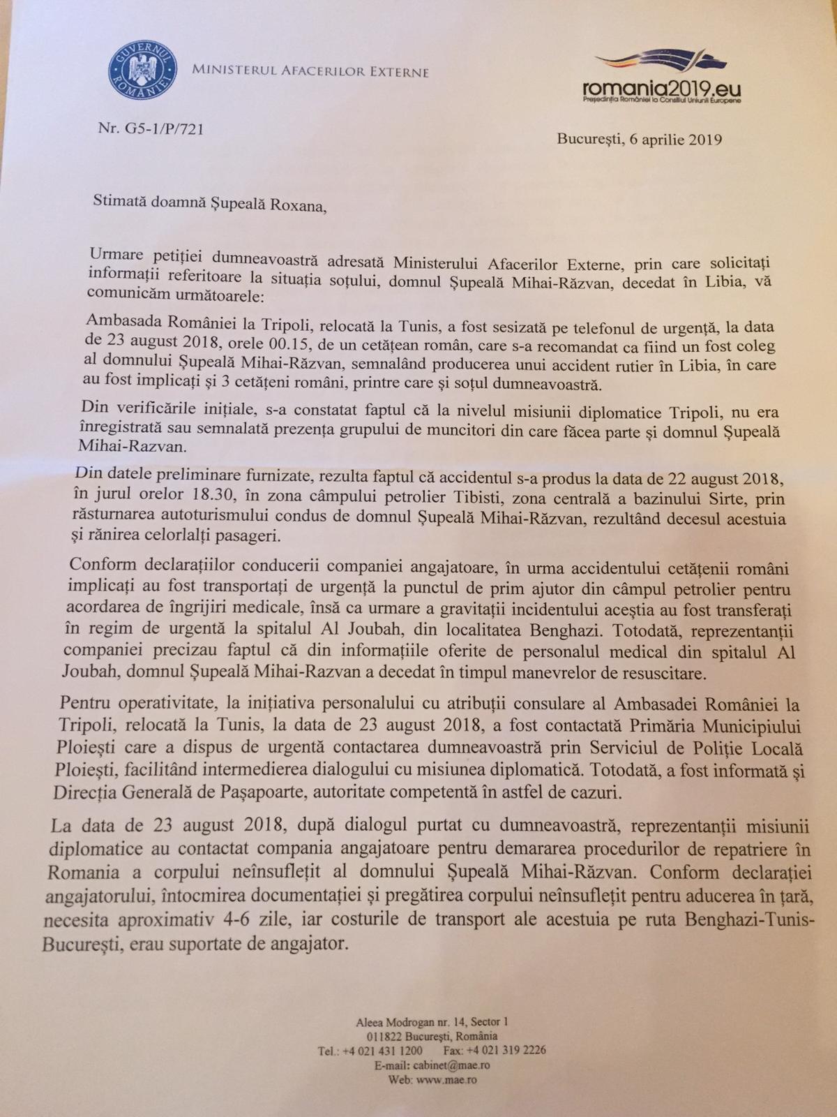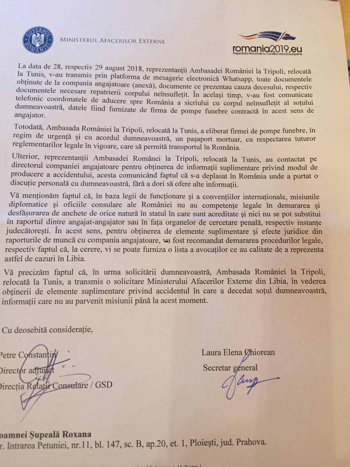 Diferit de lezarea evidenta a onoarei si demnitatii persoanei sotului meu, specialist in sectorul PETROL si de prejudiciul de imagine rasfrant si asupra familiei sale prin aceasta atitudine a Domnului Ambasador, s-a intentionat, concomitent, cu acordul si in autorat cu autoritatea libiana, demantelarea oricarei pretentii a noastre de a elucida aspectele relevate, de a deslusi elementele de analiza si evaluare a evenimentului, de a clarifica cauzele, imprejurarile care au initiat si generat moartea sotului meu, dar si concluziile care se impugn ntr-o asemenea situatie, in care un cetatean roman este declarat decedat, intr-o tara chiar si din Africa si, in contextual expus, misiunea diplomatic romana nu numai ca se implica, dar ofera support de alianta unor directii institutionale care acopera, ascund, nu asigura un process de cercetare vizibil si transparent, nu efectueaza o incadrare juridica a faptelor si msluies adevarul, in scopurile prezentate, iar aceasta in considerarea imprejurarii ca “ Legea Libiana prevede…… “
