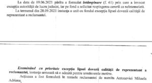 Practic,d-na Alexandra- Ioana Antonache a invocat exceptia lipsei calitatii de reprezentant al reclamantei, adica UAP al Prahova, tema pe care nu a supus-o dezbaterii dintre parti ci a introdus-o in interval in care pronuntarea a fost amanita si a dezbatut-o ea cu ea insesi. Pentru ca din acest conflict interior al domniei sale, care a durat din 28.09 pana in 12.12.2021, sa reiasa ca reprezentantul reclamantei este, de fapt, d-na Adriana Mihaela Antonevici, nimeni alta decat directorul general al paratei SC HR Star 2005 SRL, firma care a oferit serviciile de resurse umane intr-un mod atat de incompetent. Adica si-a pus in joc cariera, crezand ca sunt un idiot care nu comenteaza tunci cand este abuzat, protejand interesele firmei de resurse umane a d-nei Antonevici Mihaela Adriana printr-o imensa aberatie( a se citi abuz in serviciu) in care reprezentantul paratului este, de fapt, in opinia domniei sale, reprezentantul reclamantului, iar imputernicirea avocatiala a avocatului UAP Prahova nu i-a fost sufciienta pentru a demonstra calitatea de reprezentant al reclamantei.