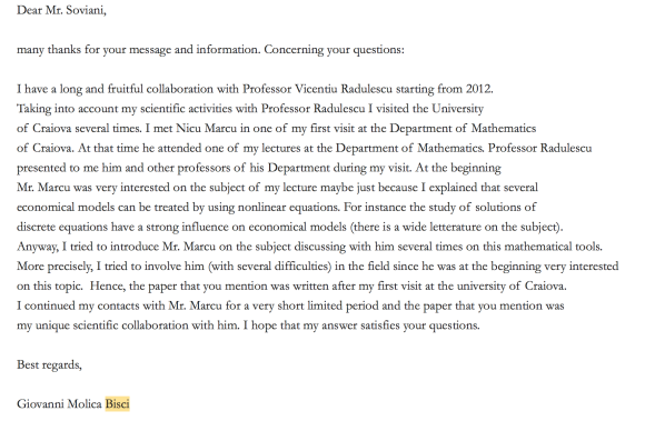 Primul autor Nicu Marcu, savant de renume mondial în opinia Politehnicii (în Laudatio din iulie 2019 se regăsește un pasaj prin care senatul afirmă fără nicio probă că alte 12 pagini publicate de Marcu în urmă cu câteva săptămâni ,,reprezintă deja o referință teoretică notabilă” (?!?)) , pare să îi facă un hatâr unei somități a matematicii, la nivel global: profesorului Giovani Molica Bisci, care apare ca și co-autor într-un articol ISI.
