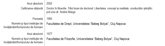 În mod obiectiv, tot ireală se arată și obținerea de către fostul șomer până la 28 de ani, în doar 12 ani în care a terminat două facultăți în orașe diferite, ajungând ca la vârsta de 40 de ani (2008) să înfașce și titlul de conferențiar universitar cu articole furate puse la mapă.