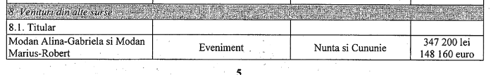 Ceea ce este deasemenea interesant în conturile ginerului lui Paul Stănescu este faptul că, potrivit declarației de avere, el a izbutit să facă să nu se regăsească în conturile comune ale sale și ale soției (pe care nu o declară nici în conturi și nici cash), suma de circa 250.000 de Euro, primită ca dar de nuntă în 2018 de către fiica lui Paul Stănescu si regista in declaratia de avere din 2019 ale fetei lui Paul Stănescu, respectiv Alina Gabriela Modan (fostă Stănescu) și ginerică Robrt Modan. Ea se regăsește doar în declarația de avere a fiicei lui Paul Stănescu, cu ocazia numirii într-un concurs ,,câștigat” la un alt combinator, fost premier, Sorin Grindeanu, ca și ,,consilier personal”.