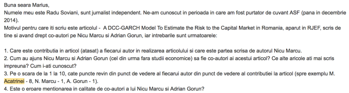 - Frauda este cu atât mai mare, inclusiv din partea lui Marius Acatrinei, întrucât, pe lângă faptul că l-a semnat (fără nicio contribuție dovedită) pe Nicu Marcu în calitate de al treilea co-autor, ca al doilea co-autor a mai trecut un profesor de litere, pe Adrian Gorun, de la Universitatea din Târgiu Jiu. Ca orice profesor de litere necunoscutăr de limba engleză, sunt convins că Gorun, ca și Marcu, pur și simplu iubeau modelul GARCH.