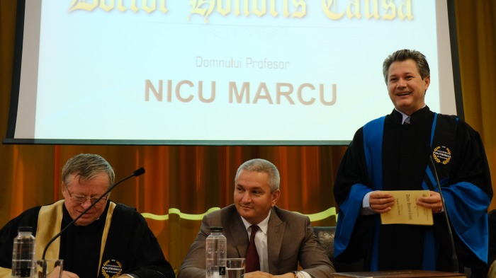 ,,Profesorul” Nicu Marcu, cel cu titlul obținut la desfiintata Universitatea Financiar-Bancară prin frauda de la Metalurgia nu roșește nici măcar o secundă atunci când i se citește ,,Laudatio’‘, prin care îi sunt prezentate fraudele academice drept ,,realizări”.