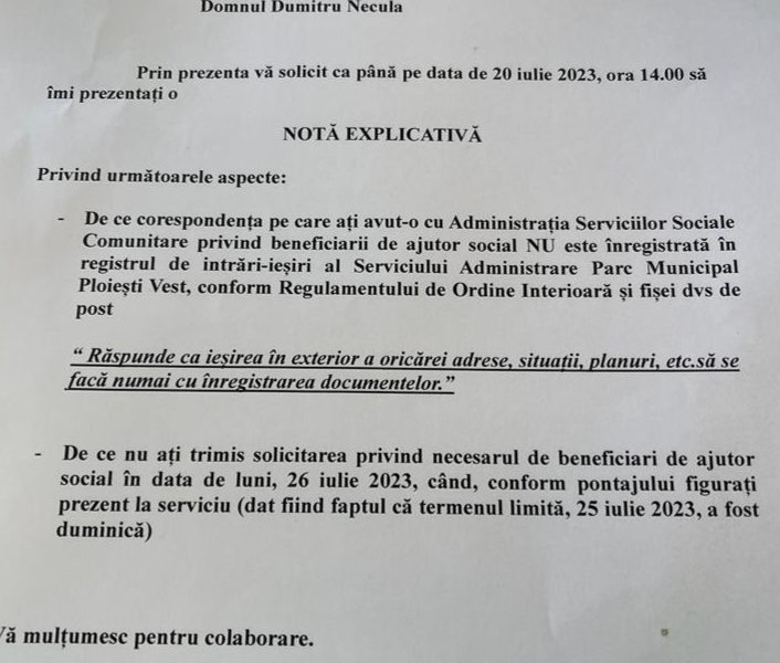 Analfabetul functional Tanasica Anca Nicoleta trece la un nivel superior, al paranormalul, solicitând o nota explicativa prin care Dumitru Necula este luat la purificat pe motivul halucinant ca nu a trimis necesarul de beneficiari în data de 26 iulie 2023, precizând și mai halucinant ca Dumitru Necula a fost prezent, în data de 26 iulie 2023, la serviciu, conform pontajului. Dacă nu ar fi de plâns am rade cu lacrimi la administrația la pământ oferita de „competentul” nostru edil.Noi în locul domnului Dumitru Necula nu ne-am prezenta în data de 26 iulie 2023 deoarece analfabetul functional Tanasica Anca a semnat și stampilat confirmand ca apare în pontaj ca fiind prezent!