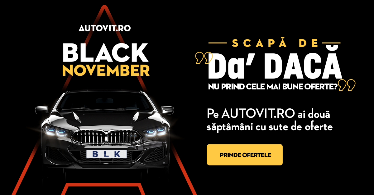 Autovit.ro a pregătit pentru anul acesta o ediție generoasă de reduceri cu ocazia celui mai mare eveniment internațional de shopping. Black Friday devine Black November pe cea mai mare platformă auto online din România, care a extins, nu doar numărul de oferte, ci și perioada de achiziție – la aproximativ două săptămâni (7-19 noiembrie), pentru a veni în întâmpinarea consumatorilor care au nevoie de mai mult timp în luarea deciziei de cumpărare a unui autoturism.