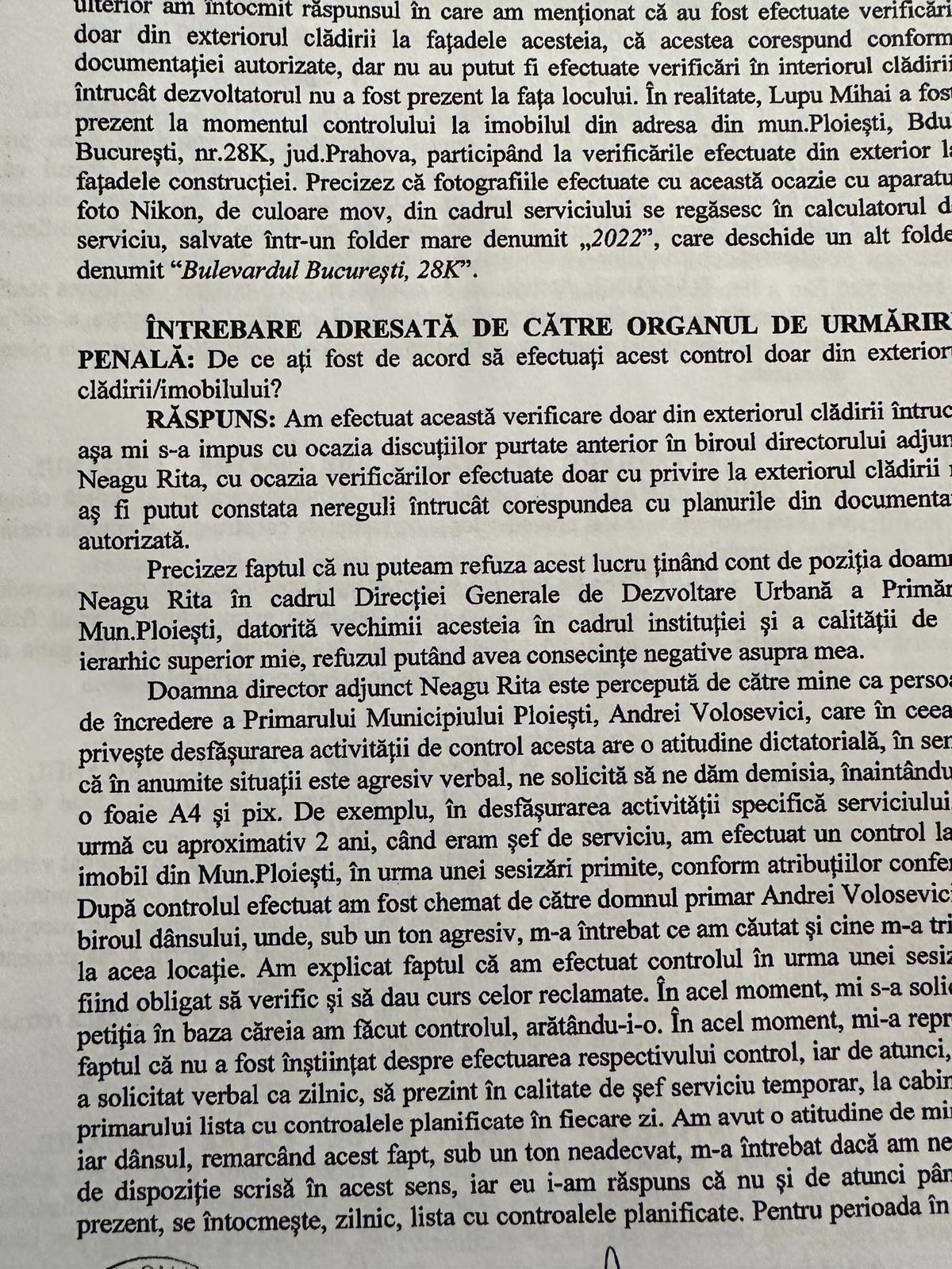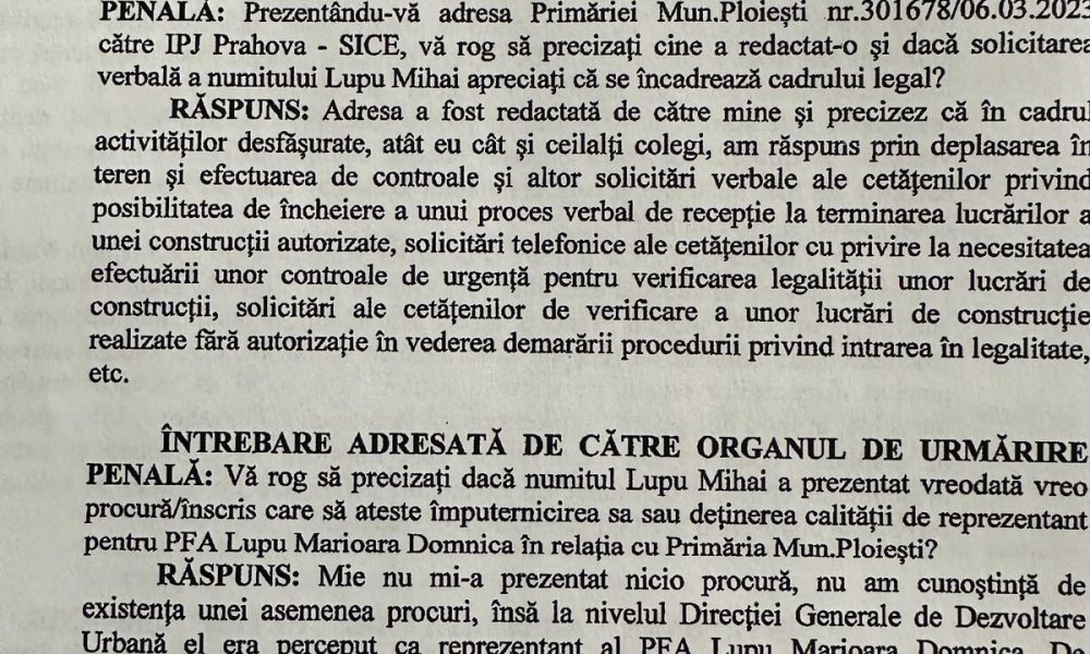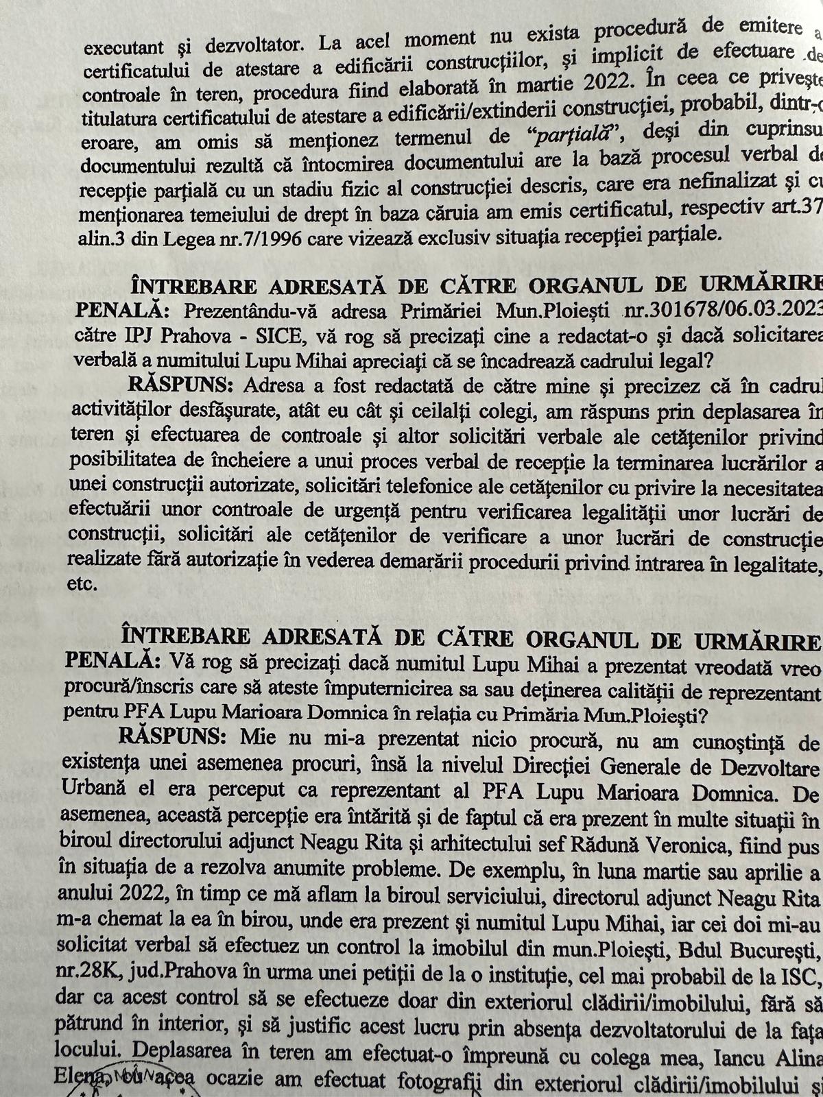 La data de 8 februarie 2024, un suspect a fost întrebat de organele de anchetă de la Parchetul de pe lângă Curtea de Apel Ploiești dacă Lupu Mihai a prezentat vreodată o procură sau un document care să ateste împuternicirea sa de a acționa în numele PFA Lupu Marioara Domnica în relația cu Primăria Municipiului Ploiești. Suspectul a declarat că, „în martie sau aprilie 2022, a fost chemat de directorul adjunct, Neagu Rita, împreună cu Lupu Mihai, care i-au solicitat să efectueze un control la imobilul situat pe Bdul București nr. 28K, pe baza unei petiții primite, cel mai probabil de la Inspectoratul de Stat în Construcții (ISC). Cei doi au insistat ca acest control să fie efectuat exclusiv din exteriorul clădirii, fără a intra în interior, justificând această decizie prin absența dezvoltatorului”.